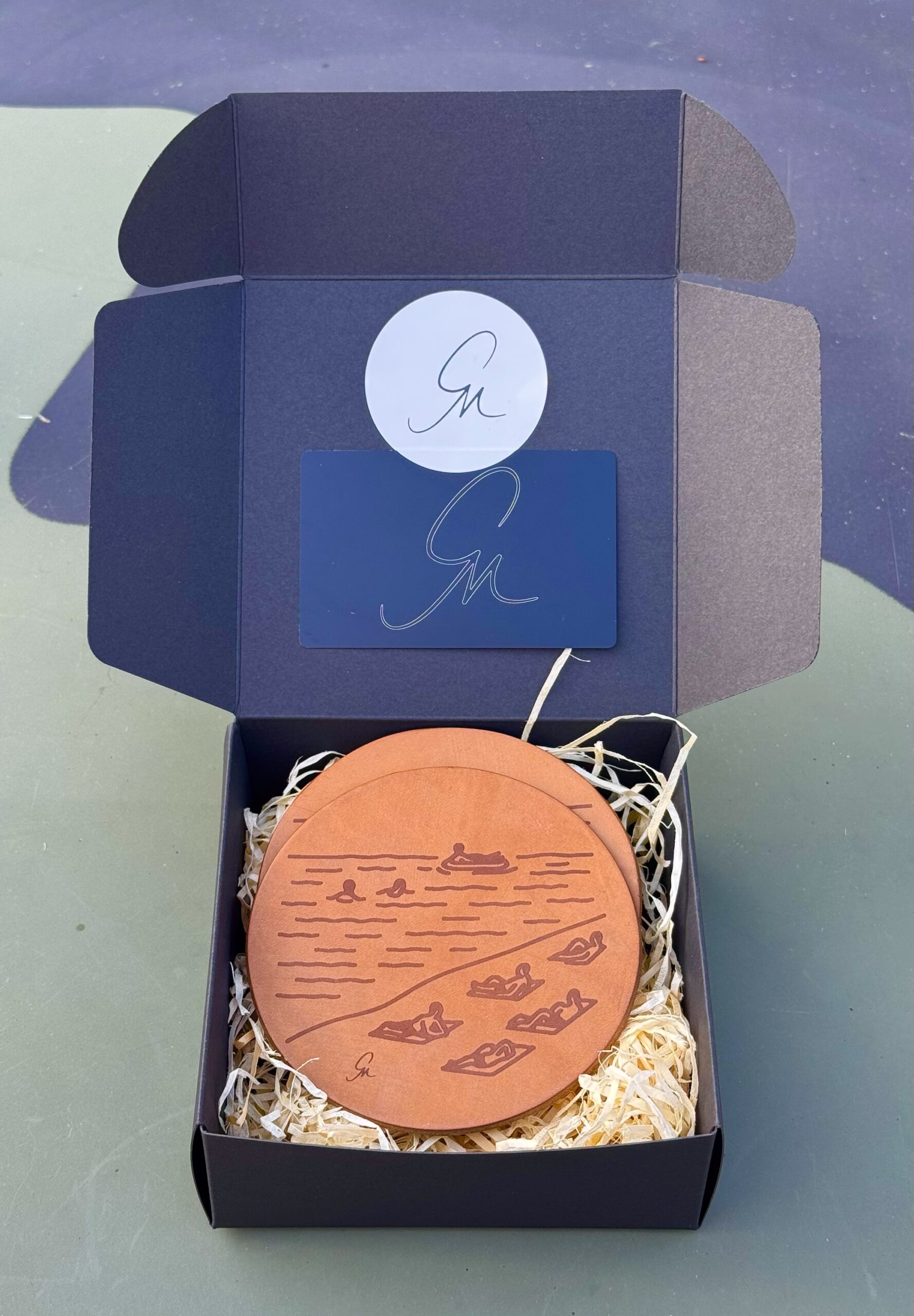 Untersetzer „Strandtag“ – Sommer, Sonne, Leder Gefertigt aus hochwertigem, pflanzlich gegerbtem Leder aus deutscher Herkunft, fängt dieser Untersetzer das Gefühl eines entspannten Sommertages am Wasser ein. Das filigrane Motiv zeigt Schwimmer, Sonnenanbeter und einen ruhigen Wellenschlag – ein kleiner Augenblick der Gelassenheit, eingefangen für deinen Tisch. Mit der Zeit entwickelt das Leder eine individuelle Patina, […]