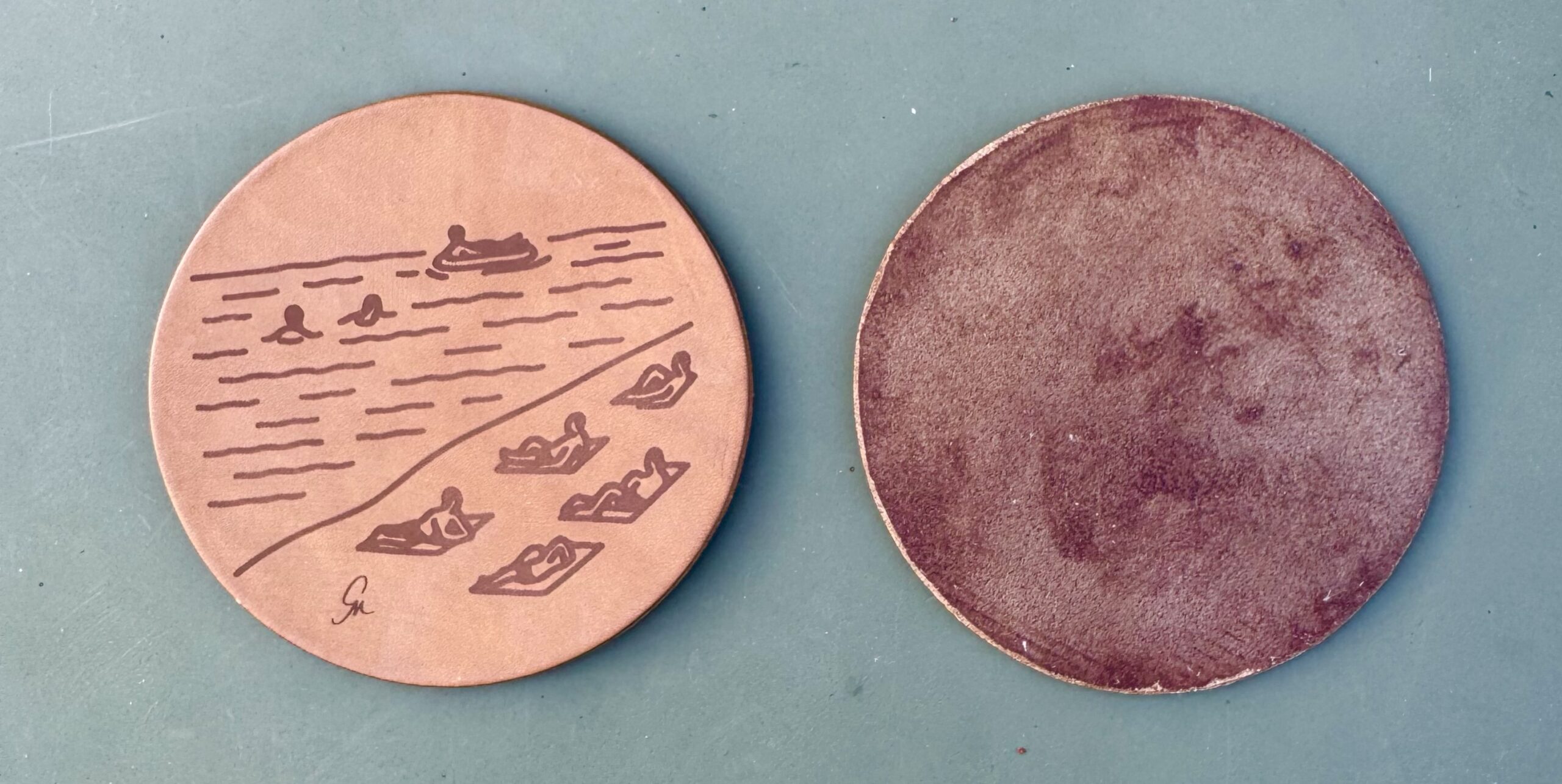 Gefertigt aus hochwertigem, pflanzlich gegerbtem Leder aus deutscher Herkunft, fängt dieser Untersetzer das Gefühl eines entspannten Sommertages am Wasser ein. Das filigrane Motiv zeigt Schwimmer, Sonnenanbeter und einen ruhigen Wellenschlag – ein kleiner Augenblick der Gelassenheit, eingefangen für deinen Tisch.